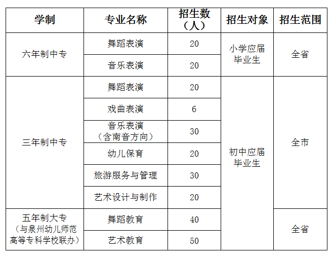 学校以“继承、弘扬、保护、发展”优秀传统艺术为目标,以培养优秀文化艺术人才为己任。办校以来,学校共开设了南音、梨园戏、高甲戏、提线木偶戏、掌中木偶戏、打城戏、北管、木偶雕刻以及舞蹈、音乐、编剧、舞台美术、闽南语播音主持、幼儿保育、茶艺表演、旅游服务与管理等十六个专业,其中南音、提线木偶戏是世界非物质文化遗产,梨园戏、高甲戏、掌中木偶戏、北管、打城戏、木偶雕刻是国家非物质文化遗产。学校戏曲类专业教育成果居全省首位、全国前列,泉州市各专业剧团95%以上的演员毕业于我校,获高级职称的有一百多人,其中国家一级演员二十多人,三人次获中国戏曲梅花奖,三人次获中国曲艺牡丹奖。近三年,学校升学率(大专及本科)均达95%以上。2002年至今,学校先后与中国戏曲学院、上海戏剧学院、福建艺术职业学院、福建教育学院、华侨大学、泉州师范学院、泉州幼儿师范高等专科学校等院校联合办学。目前,学校的学历教育形式有三年制中专、六年制中专、五年制大专三种。根据我校2023年招生工作安排,所有报名学生均需参加专业面试。具体招生计划、面试安排如下:一、招生计划数(招生专业、计划数以省教育厅、市教育局下达为准)