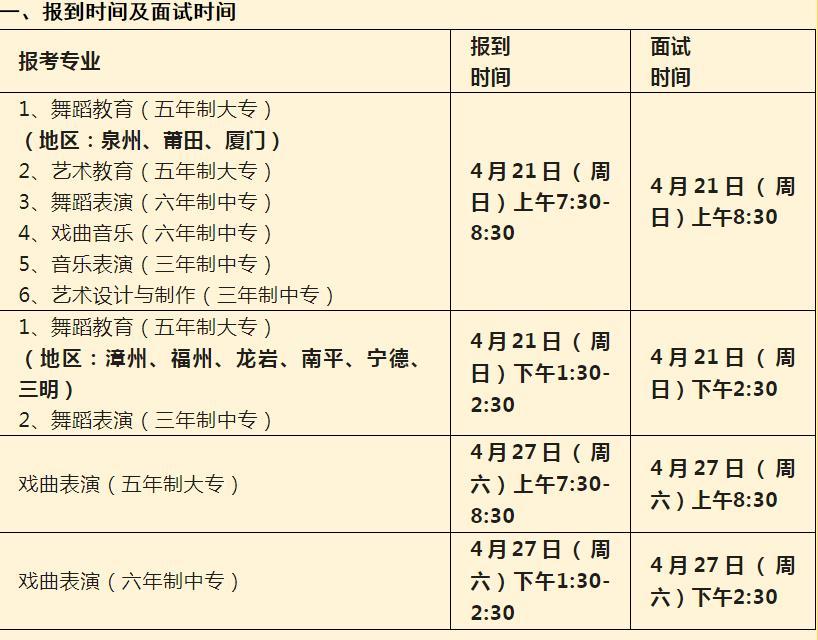 根据学校的工作安排,我校将于4月21日(周日)、4月27日(周六)对舞蹈教育、舞蹈表演、艺术设计与制作、艺术教育、音乐表演、戏曲音乐、戏曲表演等七个专业学生进行面试,考生可同时报考两个专业。具体安排如下: