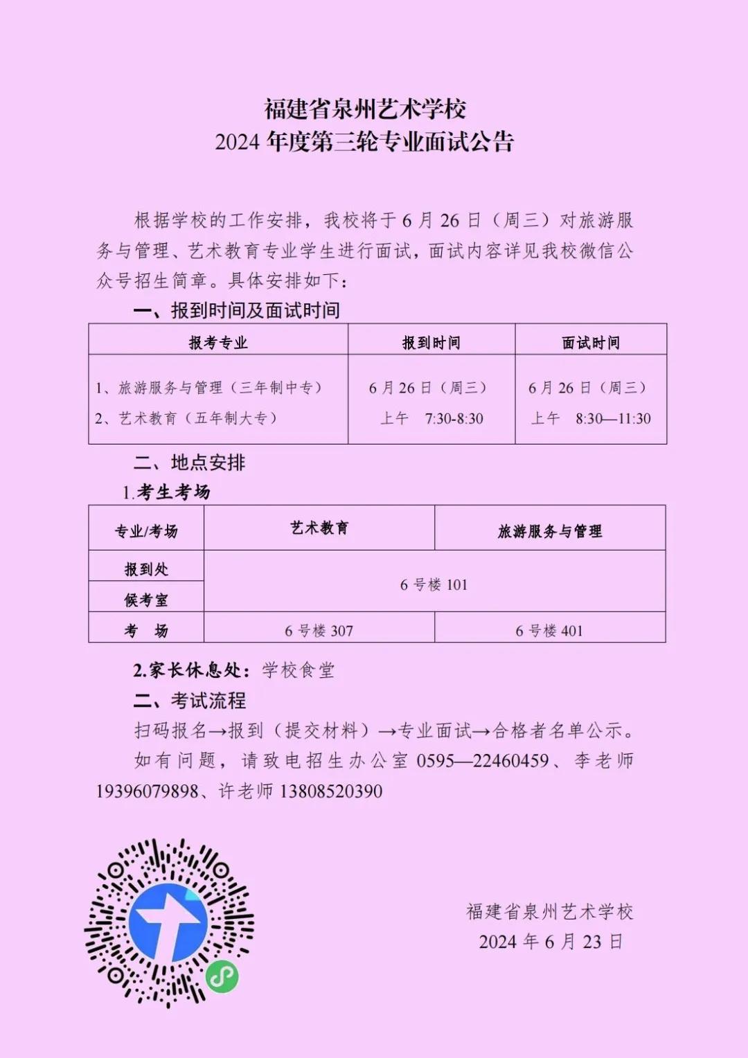 福建省泉州艺术学校2024年度第三轮专业面试公告