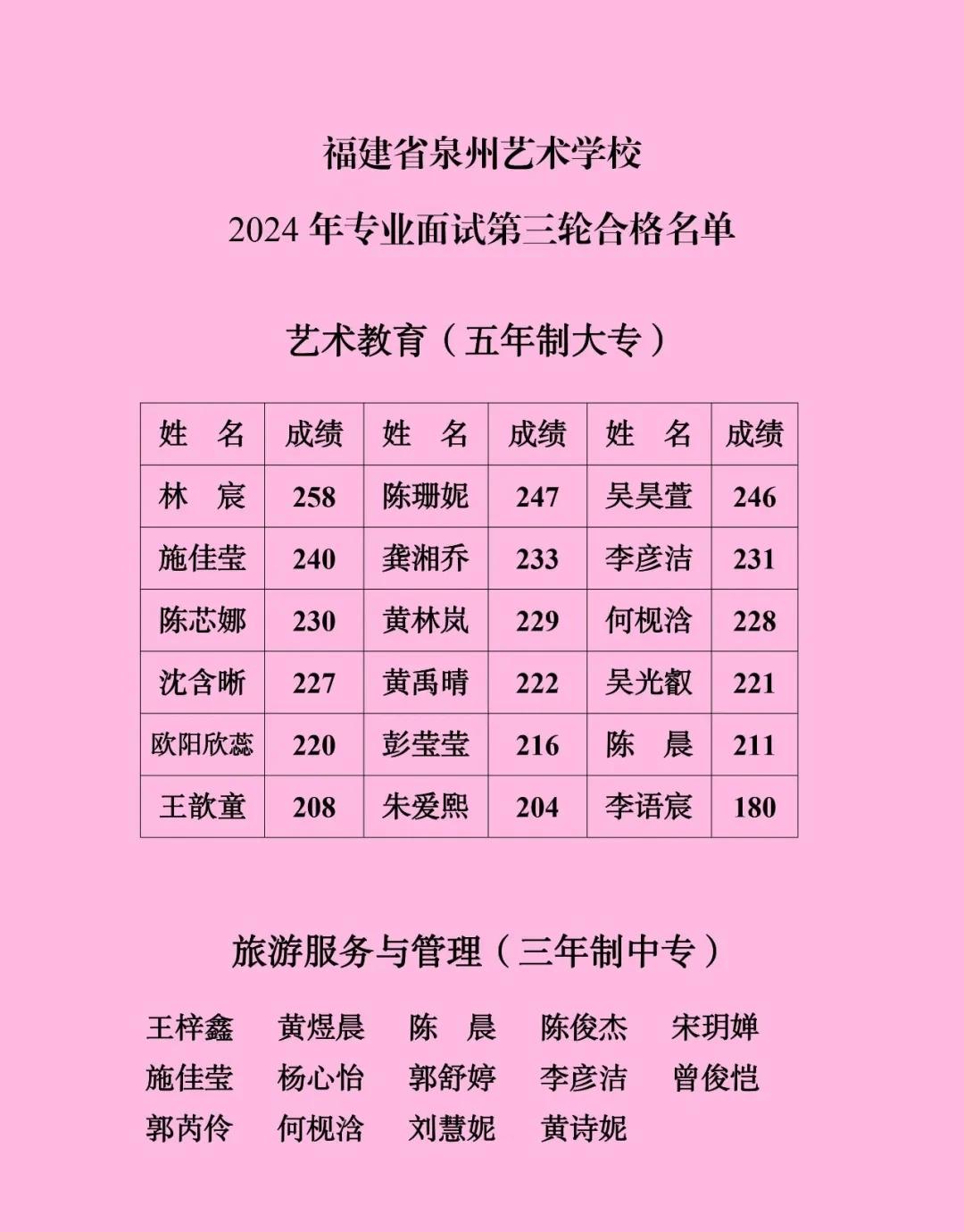 福建省泉州艺术学校2024年专业面试第三轮合格名单