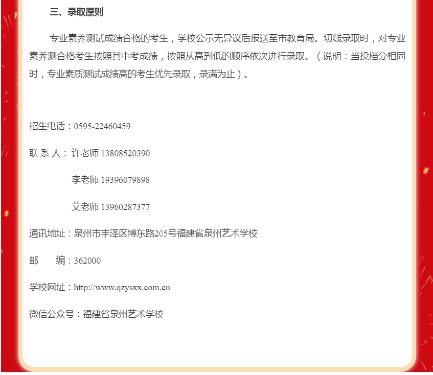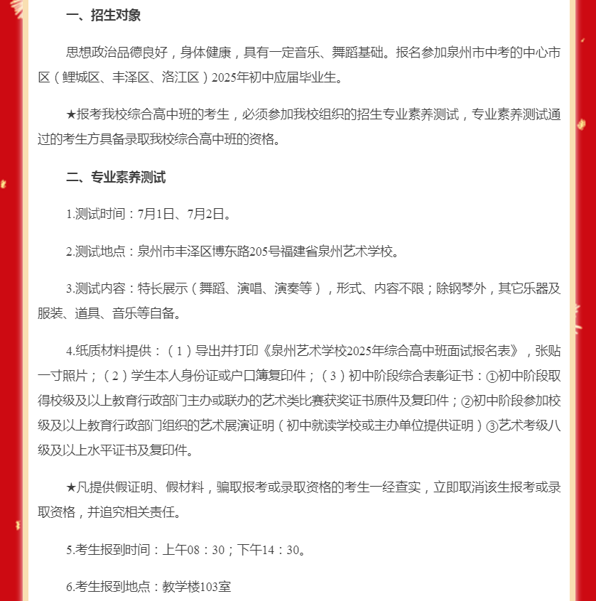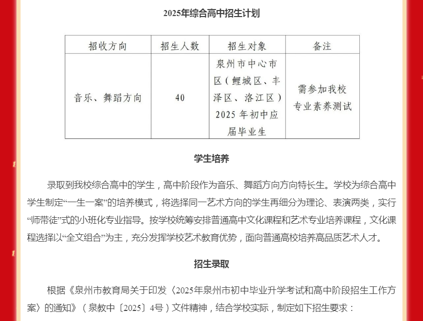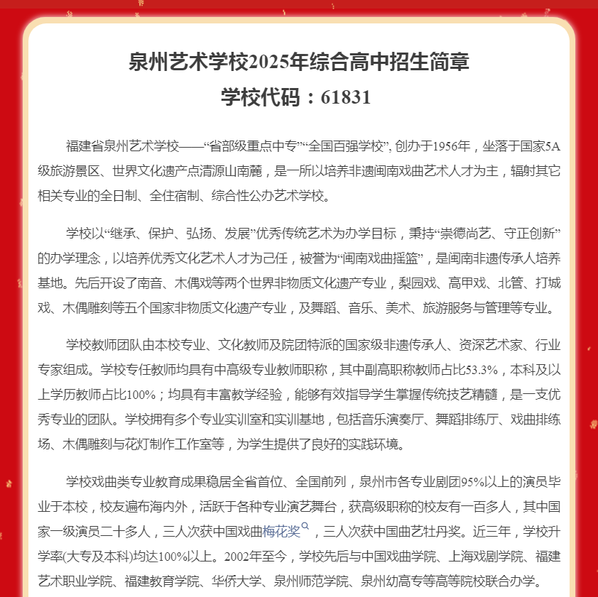 泉州艺术学校2025年综合高中招生简章