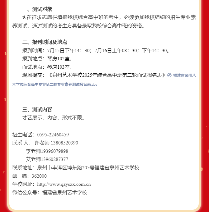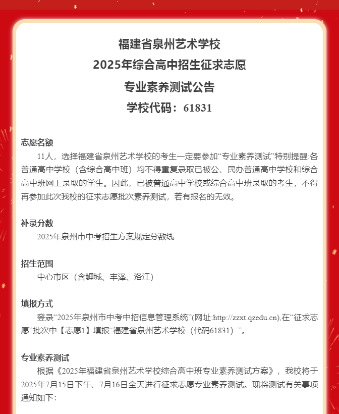 福建省泉州艺术学校2025年综合高中招生征求志愿专业素养测试公告