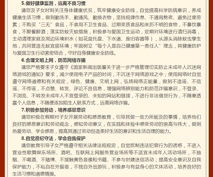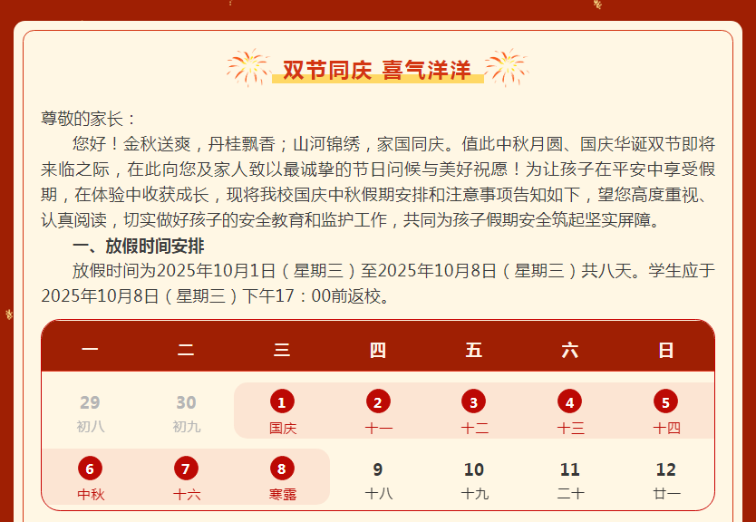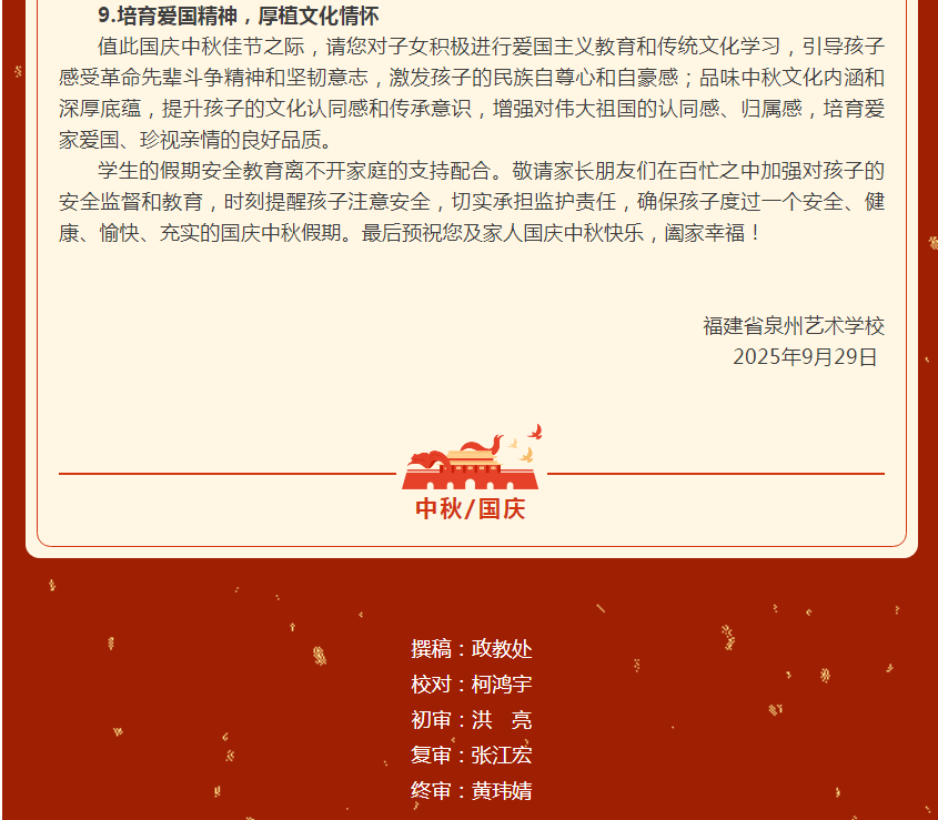 福建省泉州艺术学校2025年国庆中秋假期致家长的一封信