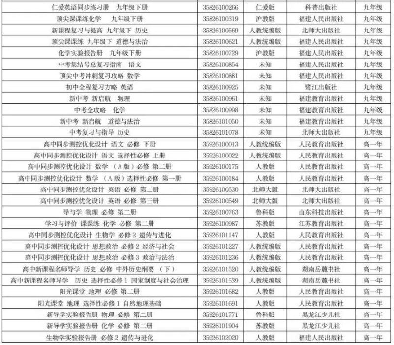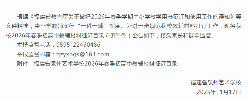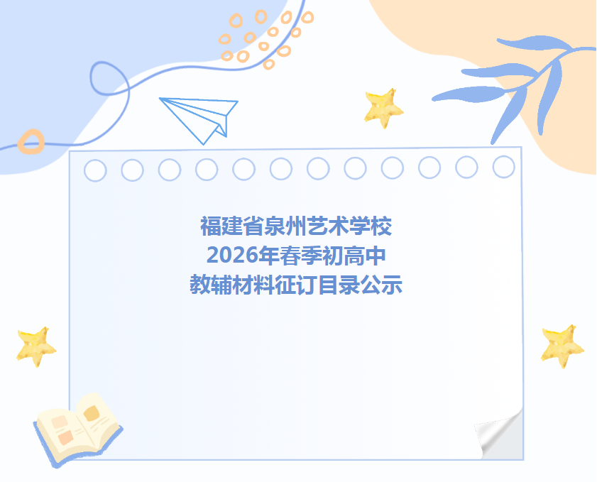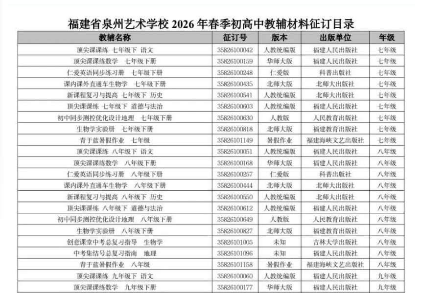 福建省泉州艺术学校2026年春季初高中教辅材料征订目录公示