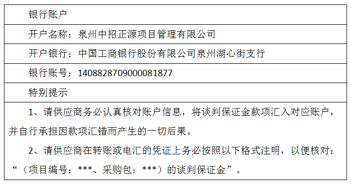方式:本项目供应商可通过现场报名或者邮箱报名获取询价通知书。以电汇或转账的方式获取,须将报名登记表(可联系代理公司获取)的完整资料发送至zhongzhaozhengyuan@qq.com获取询价通知书,现场可到福建省泉州市丰泽区田安北路231号丰泽商城综合楼514室报名获取询价通知书。